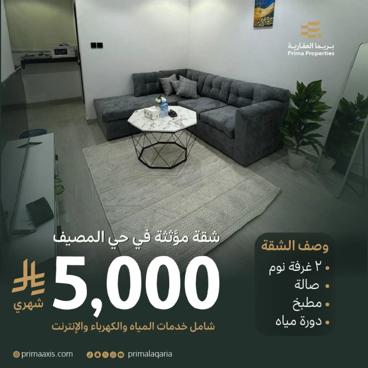 طلب اتصال | غرفتين وصالة مؤثثة – 5000 ريال - شقة في عمارة للإيجار - حي المصيف | بريما العقارية