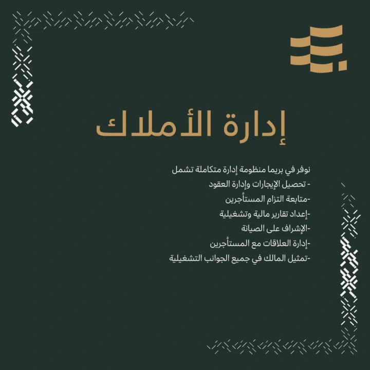 ﻧﻮﻓﺮ ﻓﻲ ﺑﺮﻳﻤﺎ ﻣﻨﻈﻮﻣﺔ إدارة ﻣﺘﻜﺎﻣﻠﺔ ﺗﺸﻤﻞ: - ﺗﺤﺼﻴﻞ اﻹﻳﺠﺎرات وإدارة اﻟﻌﻘﻮد - ﻣﺘﺎﺑﻌﺔ اﻟﺘﺰام اﻟﻤﺴﺘﺄﺟﺮﻳﻦ - إﻋﺪاد ﺗﻘﺎرﻳﺮ ﻣﺎﻟﻴﺔ وﺗﺸﻐﻴﻠﻴﺔ - اﻹﺷﺮاف ﻋﻠﻰ اﻟﺼﻴﺎﻧﺔ -إدارة اﻟﻌﻼﻗﺎت ﻣﻊ اﻟﻤﺴﺘﺄﺟﺮﻳﻦ -ﺗﻤﺜﻴﻞ اﻟﻤﺎﻟﻚ ﻓﻲ ﺟﻤﻴﻊ اﻟﺠﻮاﻧﺐ اﻟﺘﺸﻐﻴﻠﻴﺔ