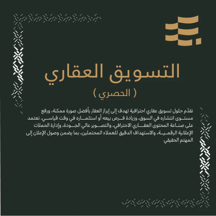 ﻧﻘﺪم ﺣﻠﻮل ﺗﺴﻮﻳﻖ ﻋﻘﺎري اﺣﺘﺮاﻓﻴﺔ ﺗﻬﺪف إﻟﻰ إﺑﺮاز اﻟﻌﻘﺎر ﺑﺄﻓﻀﻞ ﺻﻮرة ﻣﻤﻜﻨﺔ، ورﻓﻊ ﻣﺴﺘـــﻮى